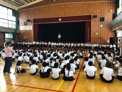 まず、7月30日に行われた「大阪市水泳記録会」に参加した児童の表彰です。夏季休業中にも水泳指導に参加し、毎日練習した成果を発揮し、大きなプールで見事な泳ぎをみせてくれました。
