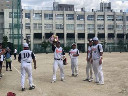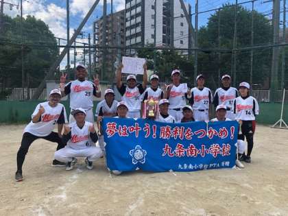 2回まで4対5とリードされていましたが、そこであきらめないのが九条南ソフトボールチーム。その後、打線がつながって見事逆転し、10対5で勝ち、優勝することができました。