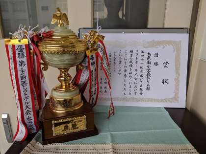 朝会で、子どもたちに、ソフトボール部のお父さんたちの活躍を紹介し、賞状・優勝カップを紹介しました。