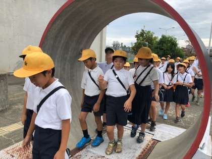 浄水場に関する映像を見た後に、施設内の見学をしました。砂の層やオゾンなどを使って実際に水をきれいにしている池などを見たり、実際の大きさの配水管の中を、水の気持ちになってくぐりぬけたりしました。