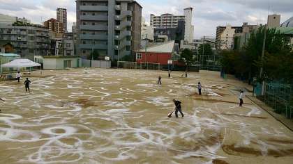 教職員で相当な重さの「にがり」の袋を均等に配置し、粉末をグランド表面に均等に広げ、水を撒きます。かなりの重労働ですが、男性教職員も女性教職員も一丸となってその作業を進めています。