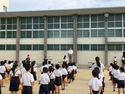 9月最後の全校朝会の様子です。朝晩は涼しくなってきたこともあり、久しぶりに運動場で全校朝会を行いました。
