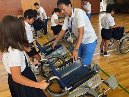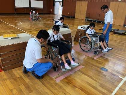その後、実際に車いすに乗り、自分で操作して、体育館に設置された街中を想定したコースで、段差やスロープなどを乗り越えていきました。