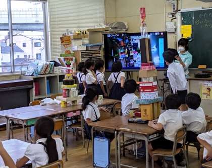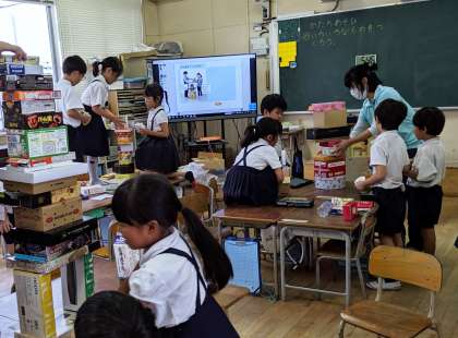 子どもたちが家から持ち寄った箱を積み重ねて、箱の形の特徴を体感します。また、何かに似た形の箱を見つけて説明したり、組み合わせて何かに似せたりと活動をしていきます。今日は、グループで高く積み上げてみました。そのためにはどんな順番で積んでいくのか、グループで相談しながら進めていきました。最後は写真を撮って発表会になりました。