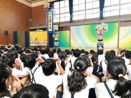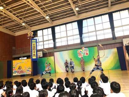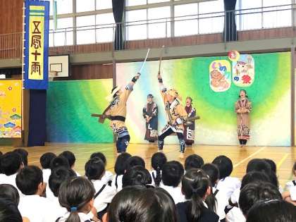 子ども達は「オンカミ」と呼ばれる祈りの仕方を教えていただき、太陽と大地のエネルギーを合わせるように、手を叩きながら「エムシリムセ(剣の舞)」や「サロルンリムセ(鶴の舞)」、「クリムセ(弓の舞)」などを、鑑賞しました。