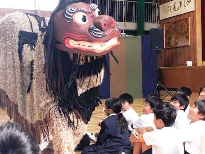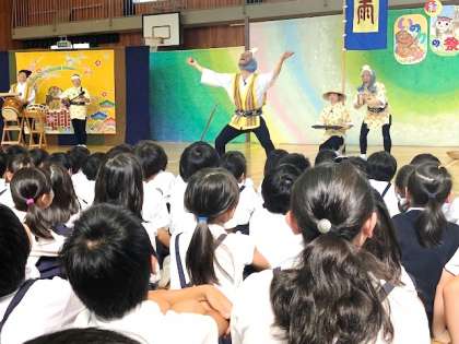 山で切った木をみんなで運ぶ様子を表した「国頭サバクイ」や、明るく働き者の沖縄のおじぃやおばぁと村人を表した「豊年踊り」などを鑑賞しました。沖縄の護り獅子、シーサーも子ども達に幸せを運びにやって来てくれました。