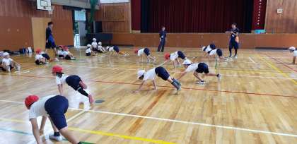 今日は、1・2年生が両手をついて歩いたり、おしりで歩いたり、低い姿勢でスタートして走ったりしました。