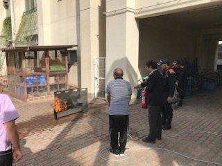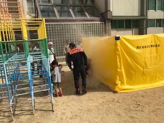 町会対抗バレーボール大会と同時に、西消防署の皆様のご協力により、先日の台風の影響で実施できなかった「水消火器」・「煙体験」の防災・消防体験が行われています。