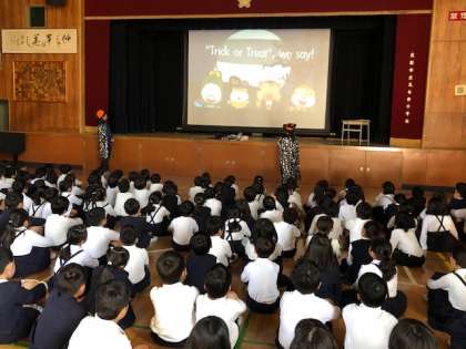 "Do you know what day is this?"と質問すると、子ども達からは元気な声で「ハロウィン!!」と返ってきました。今日はハロウィンにちなんだEnglish Timeで、みんなでハロウィンソングを歌いました。先生もハロウィンのコスチュームをまとって登場し、子ども達は大喜びでした。外国の行事の文化に触れる良い機会となりました。