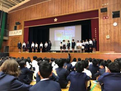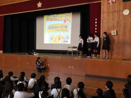今日の児童集会では、図書委員会が「ルラルさんのにわ」という絵本の読み聞かせを行いました。読み聞かせのあとは、大盛り上がりの「ダウトクイズ」をしました。図書委員の人が、わざと間違った内容のお話を朗読し、その間違いに気づくとみんなで「ダウト!!」と大きな声で叫んでいました。