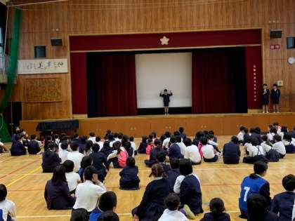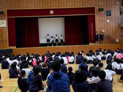 集会委員会のゲームは「ジェスチャーゲーム」でした。集会委員の皆さんが、舞台で何のジェスチャーをしているか当てるゲームです。班で相談しながら考え、大盛り上がりでした。