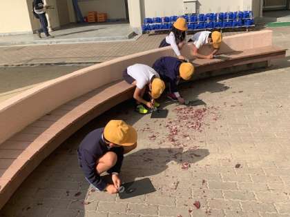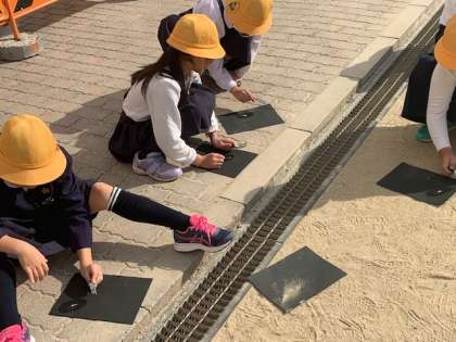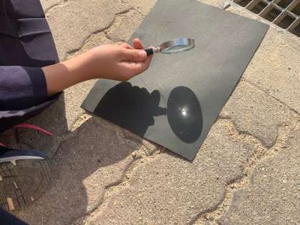 虫めがねを使って日光を集めるとどうなるのか。子どもたちが懸命に日光を集めていると、黒い紙が焦げ始めました。