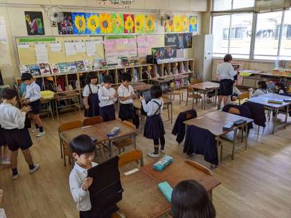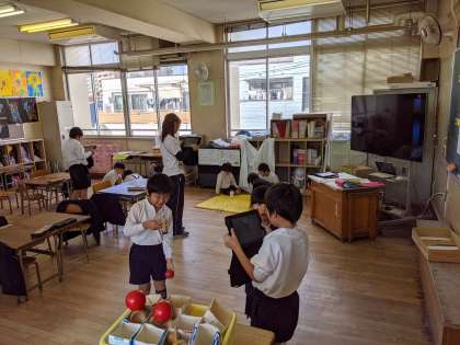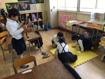 1年生は、生活科で昔あそびをしています。出会いふれあいで地域の方々から教わった「けんだま・おはじき・ヨーヨー・あやとり・こま・めんこ・おてだま」を練習しています。今日は、タブレットで撮りながら、遊びました。動画を見ながら、「どうやったらもっと上手になれるかな?」と考えながら、グループでアドバイスし合いました。
