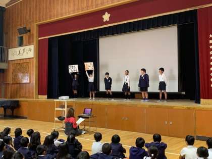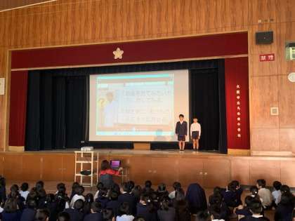 1学期に実施したスマホアンケートの結果を基にして、スマホやインターネットなどを使うことで起きやすいトラブルや、その防ぎ方をクイズ形式で紹介しました。