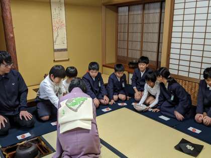 22日(金)、4年生は福音幼稚園の園長先生の茶室で茶道体験を行いました。小さなにじり口から、腰をかがめて茶室に入ると、普段の生活では体験できないような情緒溢れる世界が広がっていました。子ども達の気持ちも自然と引き締まります。