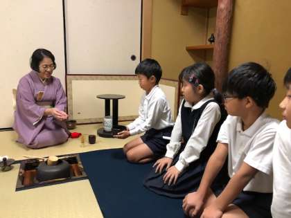 最後に、先生のお点前を拝見しました。一人一人にお抹茶が運ばれると、先生の所作をお手本にお茶をいただきました。4年生にとっては、少し苦く、大人の味でしたが、「おいしい」と感じる児童が多く、綺麗に飲み干していました。