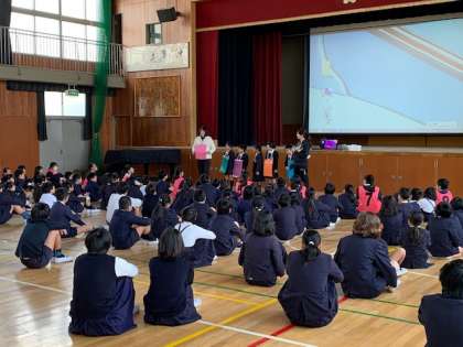 今日は可愛いゲスト・ティーチャーが来てくれました。2年生の児童が「チャン・ブルー」「チャン・ブラウン」「チャン・パープル」「チャン・グリーン」「チャン・オレンジ」に扮して、「イングリッシュソング」の音楽に乗せながら、元気に歌ったり、手を叩いたりしました。