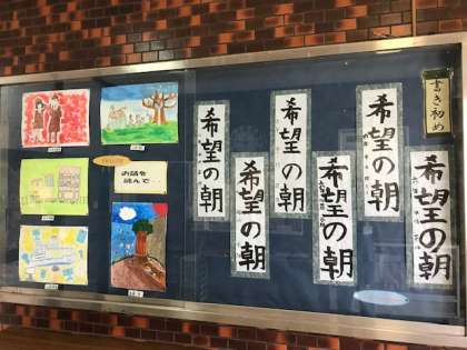 玄関掲示では、3年生の「読書感想画」と6年生の「書き初め」の作品を展示しています。他の学年も学年掲示板や各教室に展示しています。