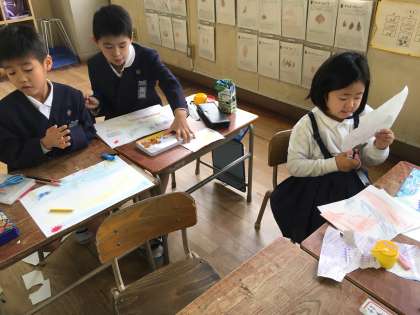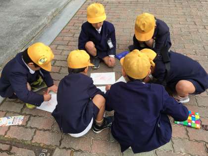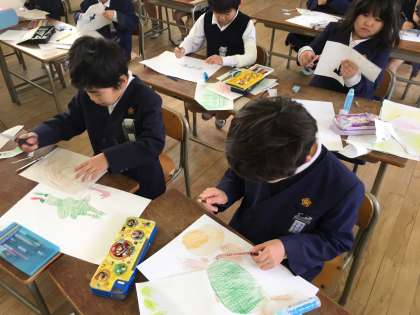 1年生の図画工作科では、先週と今日で、学校にあるでこぼこしたものを紙を当てて、色鉛筆でシャカシャカと型を写し出しました。マットや遊具などいろんなでこぼこを探しては、シャカシャカしていました。
