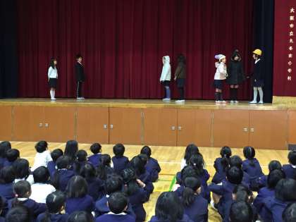 今日発表した2つの班は、学習して知ったり考えたりしたことを劇によって発表しました。セリフや動作なども自分たちで考え、全校児童のみんなに九条南会館のことがよく伝わるように工夫しました。