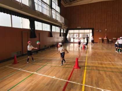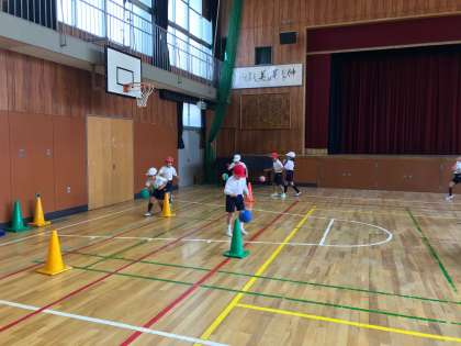 2年生の子どもたちは、ボール運動に夢中に取り組んでいます。オーバーハンドスローやドリブルなどのほかに、背面キャッチにも挑戦しています。