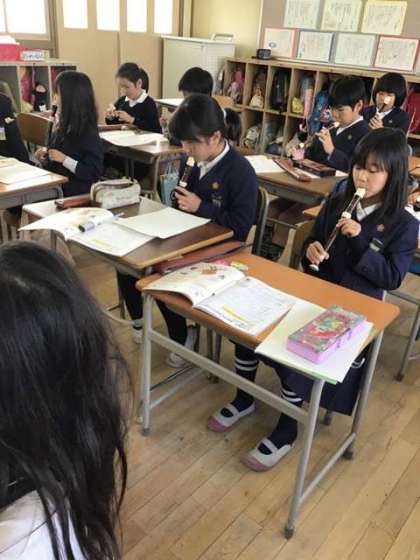 その後、「ラ」「ド」「レ」の音だけを使って、リコーダーで自分だけのおはやしをつくりました。作ったおはやしは、和太鼓のリズムに合わせて全員で順番に吹き、最後はみんなで自分たちのつくったおはやしを聴きました。