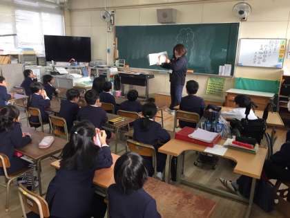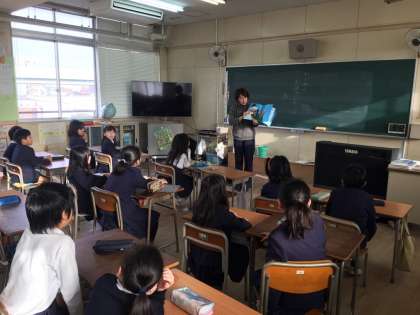 教員による朝の読み聞かせタイム「わくわくお話プレゼント」がありました。