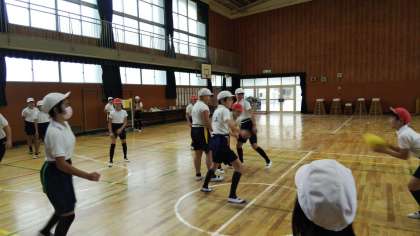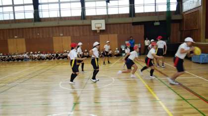腰につけたタグを相手チームに取られたら、味方にパスを回さなければなりません。タグを取るときは、大きな声で「タグ!」と叫び、取られた相手にタグを取ったことがわかるようにします。2学期に取り組んだバスケットボールとは、パスの回し方や投げ方に違いがあることから、まだまだ練習が必要です。
