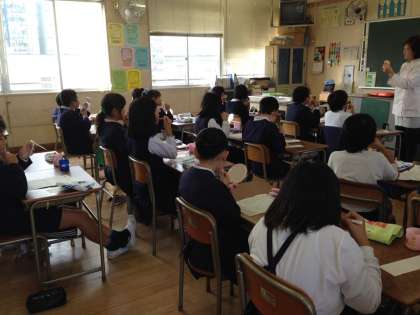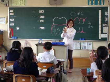 最初に教室で30分間、フッ化物や歯の衛生について学習しました。