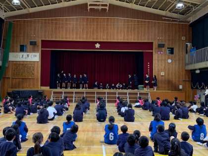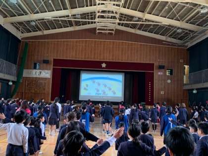 集会委員会のゲームは「この声、だ〜れだ」でした。集会委員会の人が、アニメのキャラクターの声真似をして、誰の真似か当てるゲームです。そっくりな声真似に驚きの声もあがっていました。