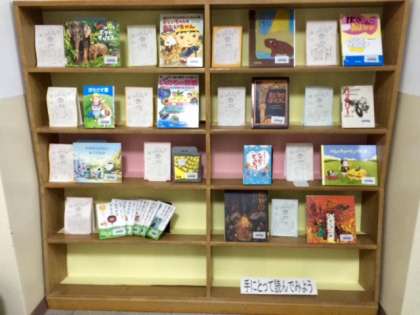 職員室前の書架には、先生方のおすすめの本と紹介文が並んでいます。