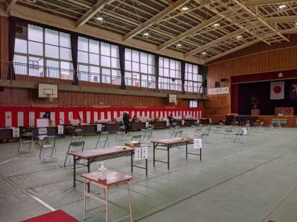 クラス分け、担任一覧も掲示しています。会場は講堂で、十分な間隔をとってお渡しできるようにしています。