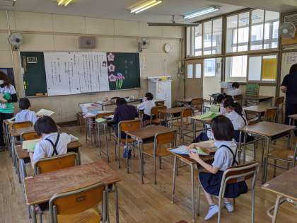登校日の今日、3年生の教室の前では、子どもたちの明るい声が響いていました。体調をたずねると「元気です。」「熱はないです。」という返事が返ってきて安心しました。