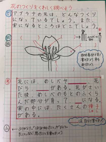 今日配られたノートの見本と教科書8ページを見ながら、花のつくりを調べて、理科のノートに書きましょう。