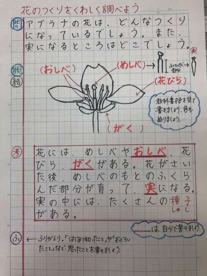 写真やノートの見本にあるように、花には「めしべ」や「おしべ」、「花びら」や「がく」があります。