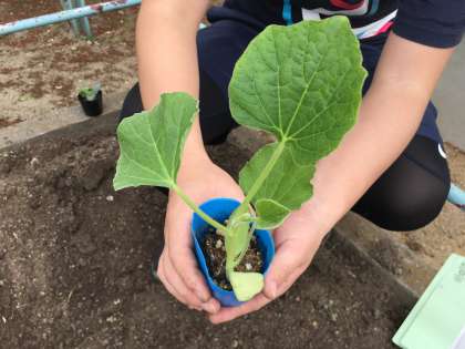 担任の先生で、ヒョウタンとヘチマを学習園に植えました。(本当は、みんなと植えたかったのですが、かれてしまうといけないので、先生たちでやりました。)理科の教科書P14を見ながら、なえを花だんへ植える方法を学習しておきましょう。