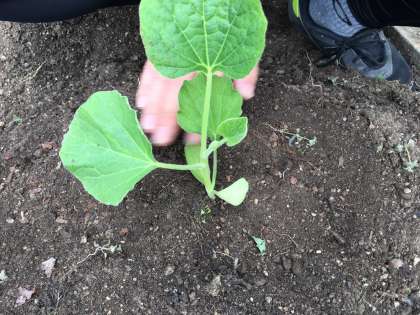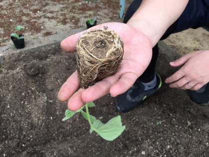 3あなをあけてそっとなえをいれて、土をかぶせます。