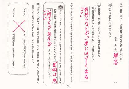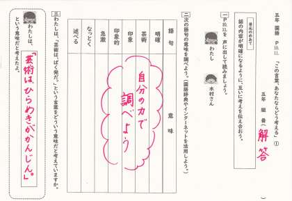さて、今日は、国語のワークシートの解答例を示します。自分の解答と見比べて、間違い直しをしておきましょう。ただし、自分の考えを書くところは、先生の解答例と見比べ、同じところや違うところをみつけておきましょう。提出したときに先生の方で、チェックしておきます。