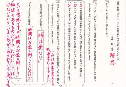 【国語ワークシート3・4】解答例です。3のワークシートの「心に残っている言葉」は、ことわざや身近な人から言われた言葉、ずっと不思議に思っていた言葉、本を読んで印象に残った言葉などから選んでいみましょう。ちなみに先生はことわざから選びました。この言葉は、先生のお父さんがよく口にしていた言葉です。みんなにも心に残っている言葉はありませんか?どんな言葉が集まるのか楽しみにしておきますね!