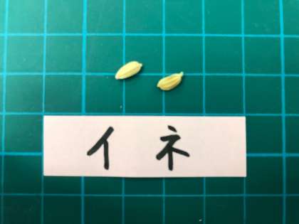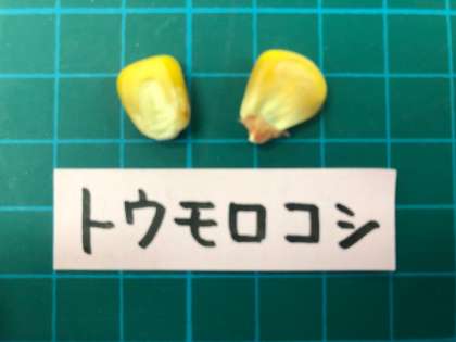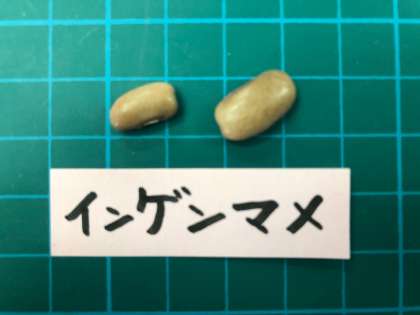 下にある写真は「インゲンマメ」「トウモロコシ」「イネ」の種子です。