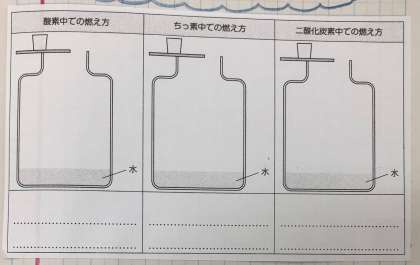 絵にあるように、びんの中に、それぞれ「ちっ素」「酸素」「二酸化炭素」だけを入れます。そこに、火のついたろうそくを入れます。