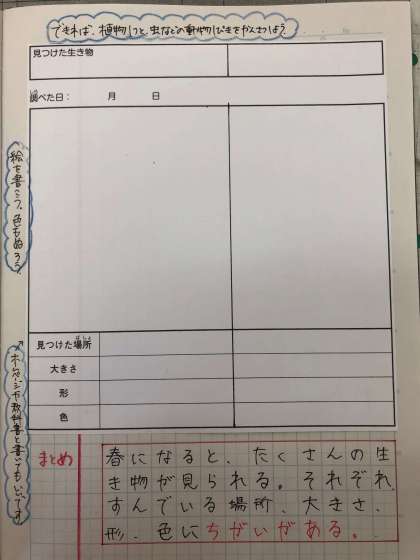 配っている「かんさつのワークシート」に、春の生き物(虫などの動物や植物)を書いて、ノートにはりましょう。