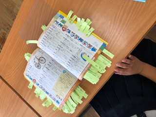 見つけた言葉のページに、付箋をはっていきます。100枚ほどの付箋を渡しましたが、もう1束全部使った人もいました。自慢の国語辞典になっています。