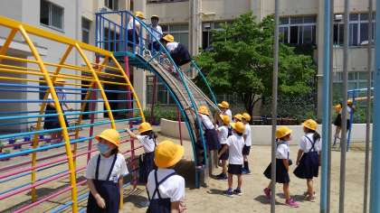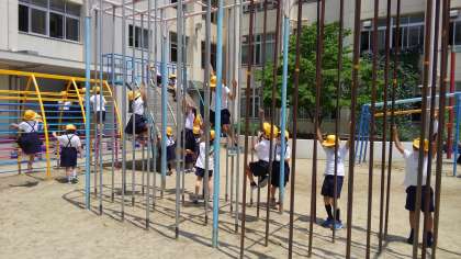 今日は、Aグループ・Bグループがそろって迎える初めての月曜日でした。遊具を使うとき、どんなことに気をつけたらいいかを確認したあと、待ちに待った「遊具デビュー」をしました。遊具で遊ぶことによって、体を支える力やバランスを取る力などが身につきます。これからは、休み時間にも遊具で遊べるので、楽しみながら体力をつけてほしいですね。