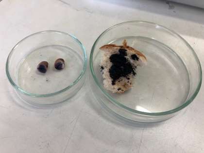 パンにもヨウ素液をかけると、青紫色に変わりました。みなさんが食べているものにも養分がたくさん含まれていることが分かりましたね。