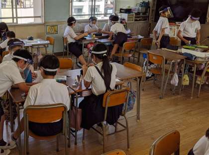 5年生が、フェイスシールドを使ってグループ活動をしていました。個別の作業の際は、はずしている子もいましたが、相談するときには付けて作業を進めました。