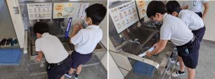 作業が終わったグループからフェイスシールドの消毒です。手洗い場へ行って、石けんで手洗いをし、その泡で表面をそっと洗います。最後に水できれいに洗い流して、教室で乾かしています。