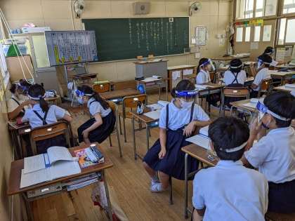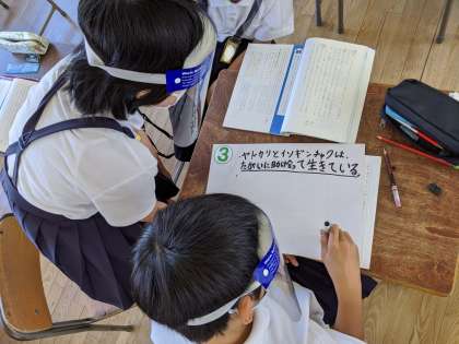 『ヤドカリとイソギンチャク』の学習で、グループの人数も3人と少なくして、フェイスシールドをつけて、「筆者が伝えたいことはなんだったのか」を話し合いをしました。大きな声を出さずに話をすると、どうしても額を寄せ合うようになってしまいます。そこでフェイスシールドの出番です。