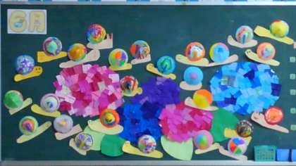 そんな季節に合わせて、教室の掲示板には、子どもたちが作った「かたつむり」を飾っています。色とりどりのカラフルな「かたつむり」たちのおかげで、雨の日がもっと楽しくなりそうです。