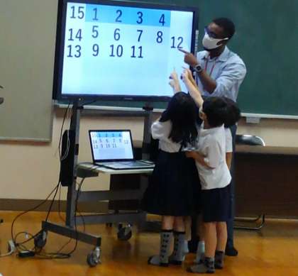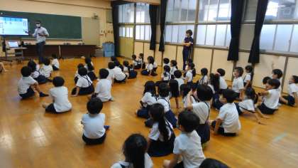 今日は、九条南小学校に来ているC−NETの「モリス先生」といっしょに英語の学習をしました。映像を使って、子どもたちが楽しめるように工夫されていて、みんな積極的に学習に取り組みました。1年生は学期に1回だけなので、次は2学期です。次の学習も楽しみです。